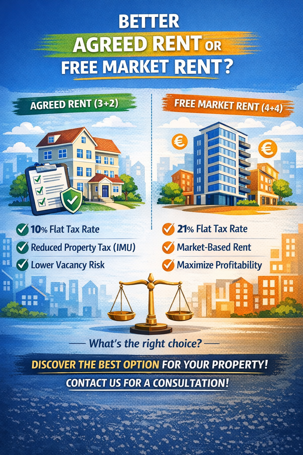 In general, an agreed rent is advantageous if the rent you can obtain is lower than the unrestricted rent by NO more than 10–12% compared to what you could obtain with an unrestricted rent contract. This is because the tax benefits (flat-rate tax and IMU discount) offset the difference in rent.
