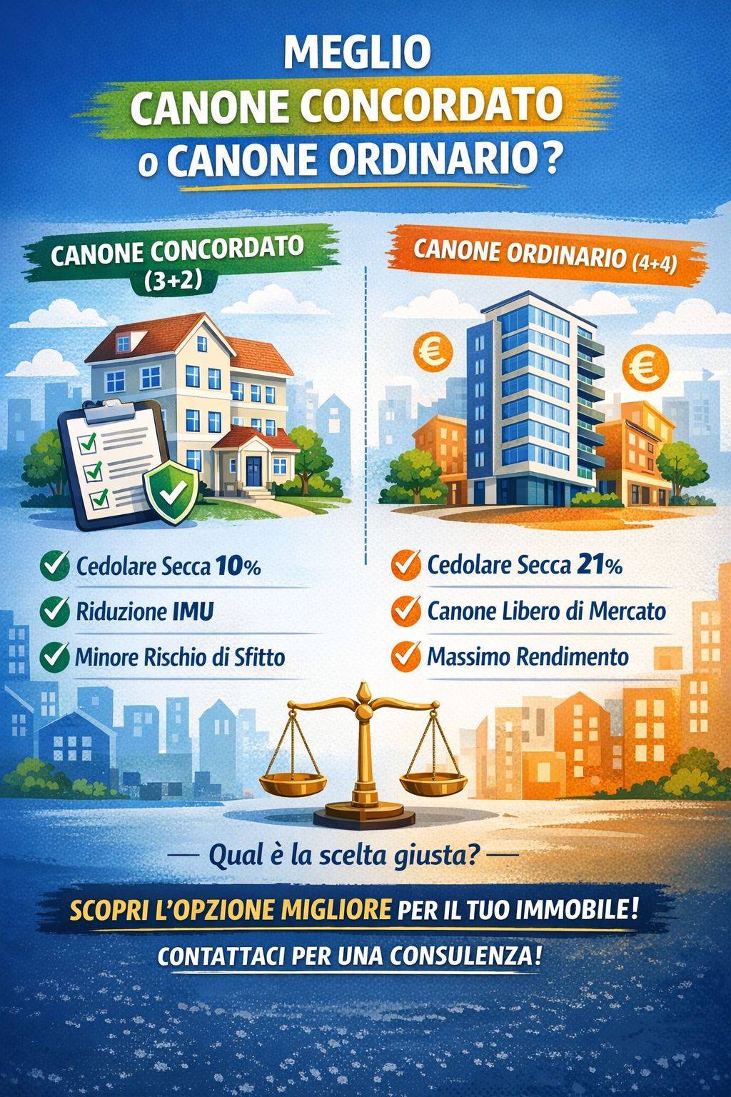 In generale, il canone concordato è conveniente se il canone che puoi ottenere è più basso del libero di NON oltre il 10–12% di quello che potresti ottenere con un contratto a canone libero. Questo perché i vantaggi fiscali (cedolare secca e sconto IMU) compensano la differenza di canone.